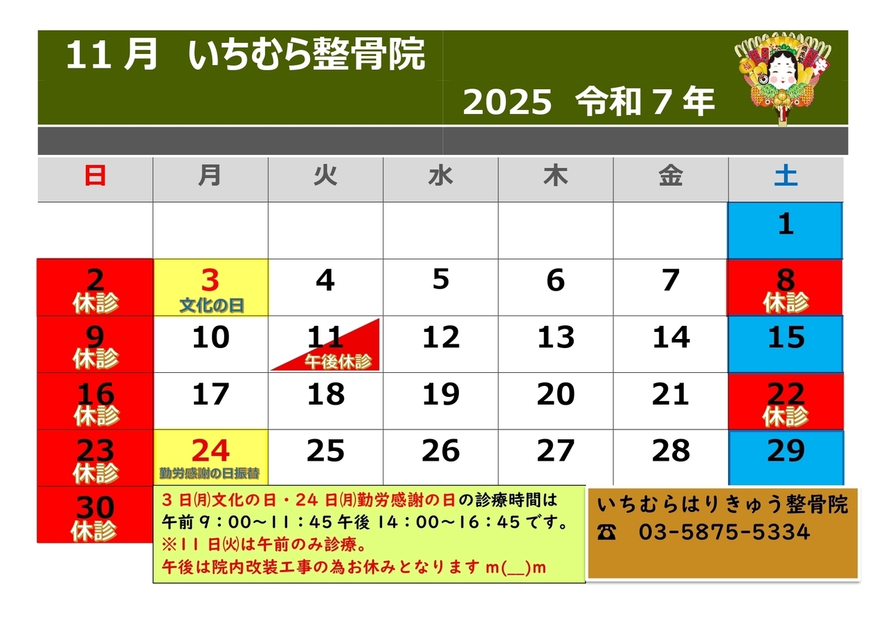 ※11㈫は院内改装工事のため午前は診療・午後はお休みです。